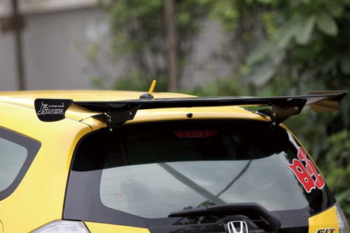 從這輛Fit身上可以發現,即使只是一輛小車,其空力套件仍是精心設計與製作,除了重新修改造型的前保桿,另外包含能增加車頭下壓力的定風翼也完全採用碳纖維材質,而前保桿下擾流為了有效降低車底氣流產生的亂流影響,J’S RACING特別將下擾流向後延伸以維持車底的平整性,對於車頭在高速行駛中能有效抑制上飄的情形發生,另外車尾後下分流器與GT尾翼,甚至包含支架同樣也以碳纖維材質製造,如此一來便能徹底執行輕量化並強化整體空氣力學。