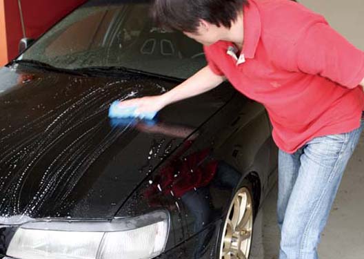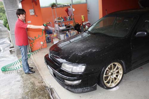 | 把車身全部塗抹一遍之後,用水將泡沫沖乾淨,筆者提醒你,如果你在有風或有陽光的地方洗車,最好採用局部清潔的方式,否則泡沫乾掉會非常難洗喔 |
