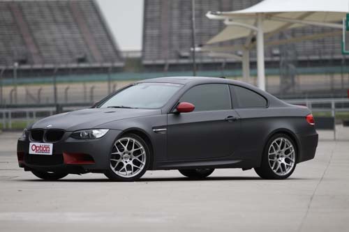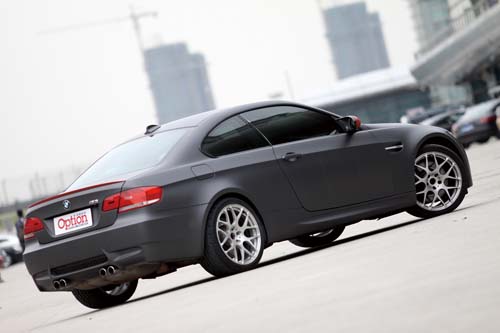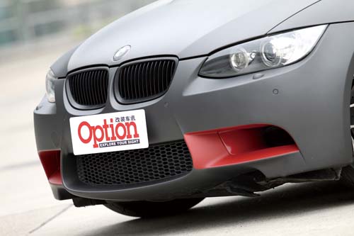 除了改裝ESS機械增壓以符合車主目前的動力需求之外,為了在外觀上也有所變化以強調與眾不同的獨特性,Tuner捨棄各大改裝品牌空力外觀進而改變全車車色,原先白色車漆已換上近年來所流行的消光黑,不但明顯將M3應有的肌肉線條加強視覺效果之外,利用消光暗紅色系在左右進氣孔與後照鏡的點綴下,同樣與車尾燈組搭配形成色系相連,全車額外增添的空力套件嚴格來說僅只有一條可愛的小鴨尾翼,同樣選用消光暗紅的搭配方式來突顯其肅殺風格。