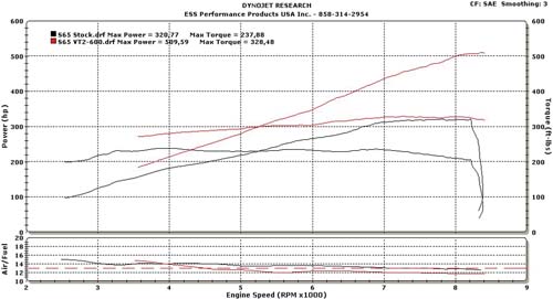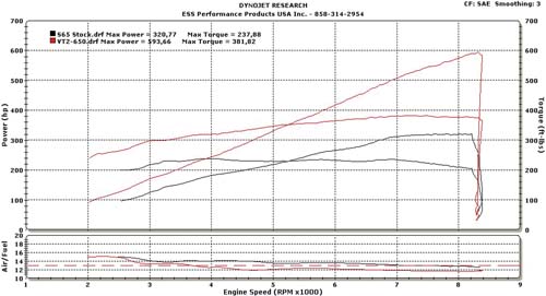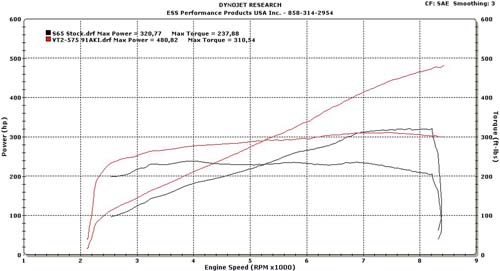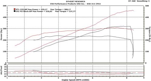 這套名為VT1-535的增壓套件可說是ESS針對新世代M3所推出的Stage 1.代表作,包含Vortech V3Si葉片式增壓本體(可承受775匹)、8支Bosch Motorsport噴油嘴、K&N高流量進氣系統、高溫鑄造塑鋼集氣箱、歧管與高溫矽膠管路等主要部件,據施工廠商Unique Motorsport技術人員表示,依照官方施工手冊大約6~8小時即可輕鬆完成,這套Stage 1.機械增壓套件雖然原廠增壓值僅僅設定在0.31Bar,在經過MSS60 ECU程式重新修正最佳點火正時、調整VANOS、EGas設定與限速破解,在維持原廠12.0:1高壓縮不降的條件下,改裝後最大輪上馬力實測已達到460hp/8400rpm〈338.1Kw〉,扭力則為42.5kgm〈417.3Nm〉。