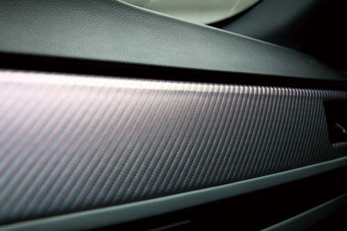 | 為了讓內裝在視覺上能跳脫M3制式的碳纖維風格,車主刻意改用變色貼膜讓內飾除了有碳纖紋路之外,變色效果的貼膜還能隨著光源有不同色調變化。 |
