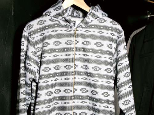 | Aztec Zip Hoody 建議售價NT2880 是以阿茲特克的民族風圖騰為發想,減去較為鮮豔的配色,以內斂的黑灰色做搭配,以手繪方式完成的圖騰看得出被賦予很多心思。 |