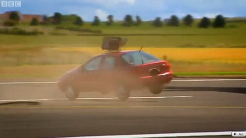 看完這則令人震驚的影片之後,才發現原來好萊塢影片中,那些車輛在飛機引擎後方狂追飛機的畫面都是騙人的,因為如果車輛真的在飛機引擎後方追逐的話,就會像影片中的Ford Mondeo或是Citreon 2CV一樣,如紙片般的被引擎的強勁渦流吹離地面,甚至在瞬間被撕裂!請連結觀賞精采的影片http://www.youtube.com/watch?v=ZJ9uWsvR1l0&feature=player_embedded。