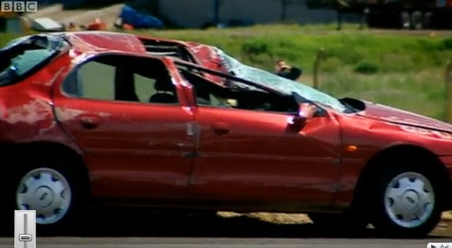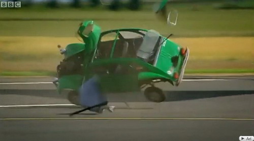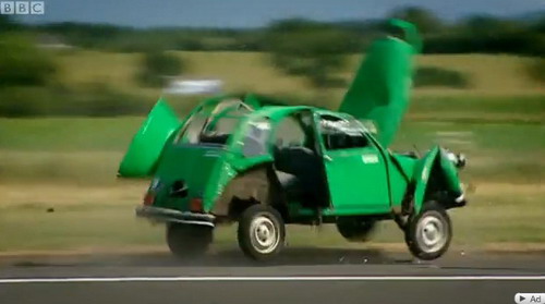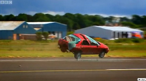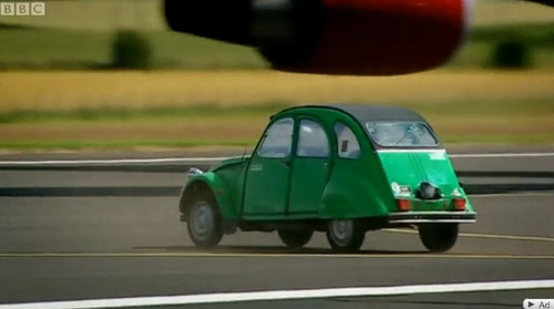這是由英國相當知名且專業的汽車節目Top Gear所進行的高難度測試,他們大陣仗地找來了一架「波音747客機」以及Mondeo、2CV兩部測試車,測試項目是當車輛行經747客機後方引擎時,是否能夠承受得住渦輪引擎所產生的強大窩流推力,雖然結果如大家所預料的「應該承受不了」,但卻萬萬沒想到,這引擎後方在加速時的推力竟是如此強大、劇烈,讓1噸多車重的Mondeo,就像紙片般瞬間被吹離地面,同時車身鈑件硬生生地在空中遭吹散、撕裂,支離破碎的車身殘骸被吹到2、30公尺外,這畫面實在是令人震撼!
