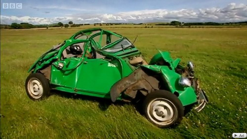 | Citreon 2CV被引擎窩流推出吹送至更遠的草地,整輛車已經嚴重破損變形? |