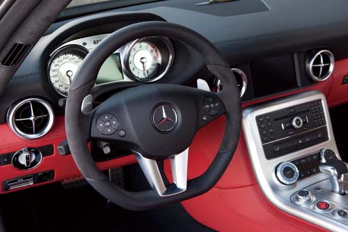 | Kicherer雖然為SLS採用消光黑的塗裝,內裝卻是大對比的紅黑配色,展現出跑車特立獨行的風格。 |