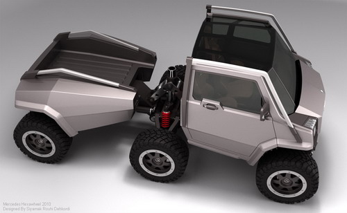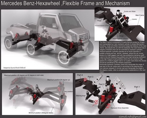 人家常說「造型設計師」通常都擁有比一般人更天馬行空的想像力,這句話一點也沒說錯,尤其是這位35歲伊朗籍的M.Benz機械工程師「Siyamak Rouhi Dehkordi」,他為M.Benz設計了這款造型超怪異但卻擁有強悍off-road能力的「Hexawheel」六輪越野概念車,不但獲得眾人注目的眼光,更讓汽車不再是大家印象中「四個輪子」的移動工具。