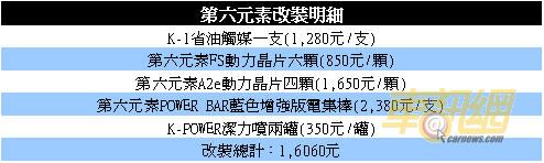 這支高科技K-1液態省油觸媒切合現代人迫切省油需求,所以上市後即被搶購一空,OP也實際安裝包含K-1省油觸媒在內的各式第六元素產品,實測其超能省油功效。
