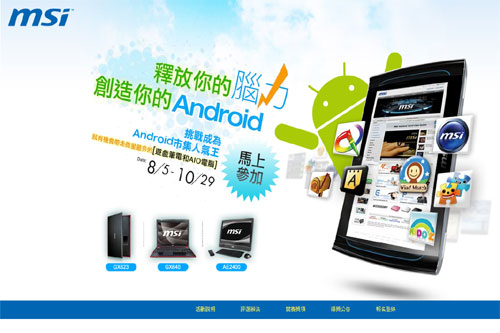 詳細活動規則說明,請至微星官網 http://tw.msi.com中「釋放你的腦力,創造你的Android」活動專區,或直接進入http://event.msi.com/2010/android01/ 活動網址即可。