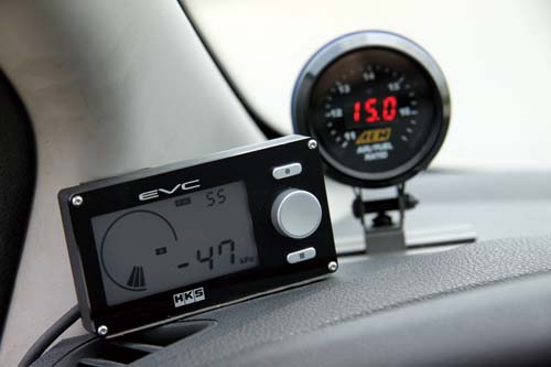 | HKS EVC能隨時提供渦輪及時的增壓狀態,至於AEM空燃比機則能提供駕駛與Tuner及時的引擎資訊。 |