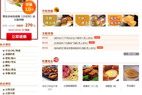 為了因應即將到來的中秋佳節,TakoMama.com開站啟動中秋專區活動,邀請站內11大廠商、聯合推出37種鳳梨酥,進行『中秋美食、一站搞定』活動;另外從9/3起至9/14,TakoMama.com將推出『中秋大樂購』活動,每天會有一款神秘中秋商品,以超低特價、限量、限時的方式販售,每人限購一組,任何人均可購買,機會難得、要買要快喔!