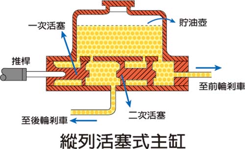| 圖示為總泵內油道的設計,可以清楚看到內部採用雙重活塞與前後煞車油路分開的設計,目的在確保其中一方一定能提供制動力,而不會 因油管或活塞故障而喪失煞車效果。 |