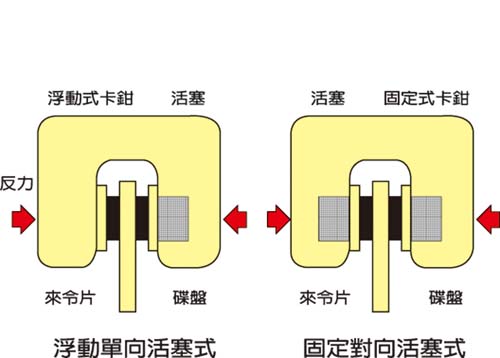 | 圖上所示為單活塞卡鉗與多活塞卡鉗的作動圖,可清楚看到單活塞卡鉗要讓兩邊來令片都產生夾力是需透過反作用力來達成,而多活塞卡 鉗則是主動推擠兩側活塞,因此後者有更快的煞車反應、更平均的夾力與更大面積的作用力。 |