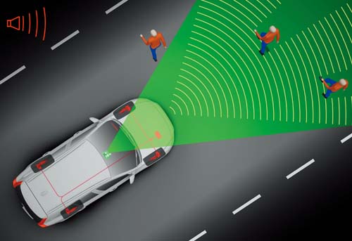 | 內建於前擋頂端的多功能感應系統,會自動偵測在行駛車輛前方出現的行人,並且提醒駕駛人注意,必要時會自動啟動煞車降低碰撞機率。 |