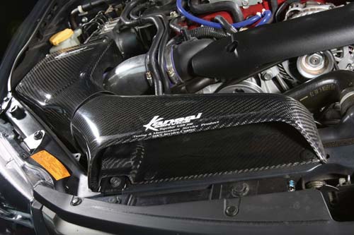 | 這組HKS Kansai進氣組非常巨大,而且採用Carbon材質製成能有效隔絕引擎室熱氣,使進氣效率大幅升級。 |