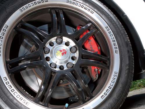 | 為了提昇操控性能,以BC避震器為AOE防傾桿為主要搭配,制動系統則採對向六活塞及328mm碟盤來應付170hp(124.96千帕)以上的動力輸 出。 |