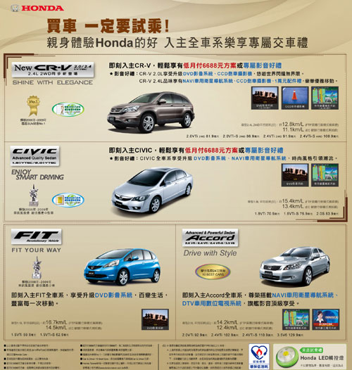 九月底前領牌,Honda全車系除享專屬交車禮,購買CR-V及CIVIC車主另有超低月付方案可供選擇,首年每月只要$6,688元即可輕鬆開回家。各項優惠如下:入主都會時尚休旅CR-V 2.0L升級DVD影音系統與CCD倒車攝影配備;CR-V 2.4L享有NAVI衛星導航、CCD倒車攝影配備;個性房車CIVIC全車系升級DVD影音系統及NAVI衛星導航;入主尊榮大器Accord,全車系升級NAVI衛星導航及DTV數位電視;擁抱FIT百變生活,即刻享受升級DVD精采影音。