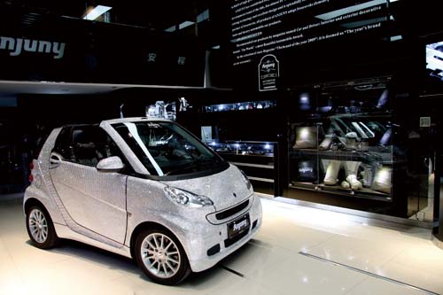 當全車貼滿Swarovski水?的Smart正式亮相後確實讓人驚豔,雖然車身尺碼僅長2.65m,但實際使用的水鑽數量卻高達283,960顆,驚人的數量換算成實際價格已讓車價翻上一倍,在長達一個多月的施工過程之中,雖然難度上並非像重度改裝車那樣具有高專業性,但整齊劃一的排列方式還是可以看出施工者展現了極為精緻的施工手法,畢竟排列好壞與否將直接影響實際水鑽在車體表面所呈現的視覺效果,而這兩家奢華品牌相互結合的效果也成功創造了新的視覺感受。