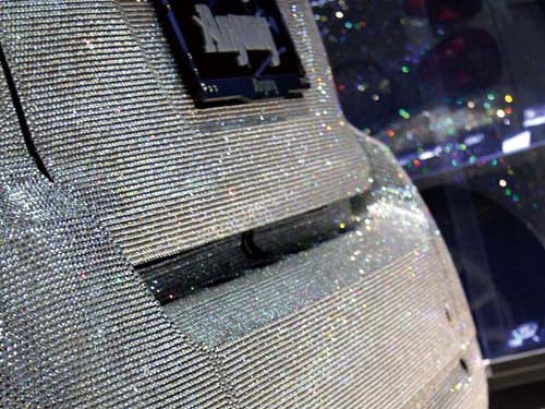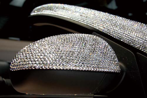 | 即便是車外後視鏡也都要以相同手法貼滿水鑽,霧黑色材質與水鑽相互呈現出的高度反差凸顯其高質感。 |