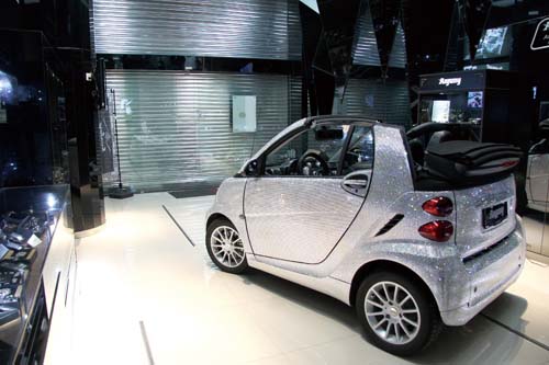 在近距離採訪之際,發現到全車除了水鑽排列依照車身線條進行黏貼之外,所有邊角處包含前/後燈具、門把、後照鏡等處的黏貼方式更是不馬虎,整齊劃一的排列組合真的需要相當長的工作時間才能完成,而拍攝過程中隨著燈光與照射角度的改變,水鑽面就像是變色龍般的不斷轉換七彩光芒,耀眼的外觀讓人愛不釋手,還記得幾年前曾在東京改裝車展上見到全車貼滿水鑽SL的瞬間,極為奢華、獨特又具美感的晶鑽外衣確實深深吸引在場每位觀眾的目光(尤其女性),不過當時空背景轉移至今,同樣的奢華感並不會因時間與車型改變而有差異,與眾不同的外衣加持讓Smart也展現出完全自我的頂尖奢華風。