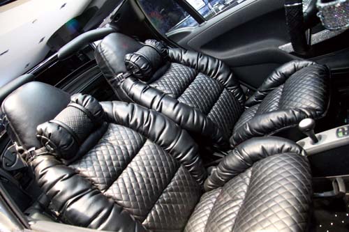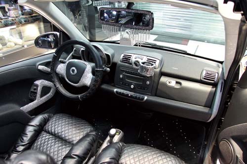 除了令人為之驚嘆的水鑽車身外觀之外,對於內裝方面的變化手法同樣採用「鑽式設計」,礙於道路上行駛駕駛需要有良好的視線,雖然沒有外觀那麼大幅度的鑽化處理,但在細節部分的裝扮同樣不可缺少,包含方向盤、車門飾板與中控音響旋鈕都採用相同方式,甚至外掛置杯架與腳踏墊也有相同之處,藉由簡單而明顯的點綴方式也能與外觀相互呼應。
