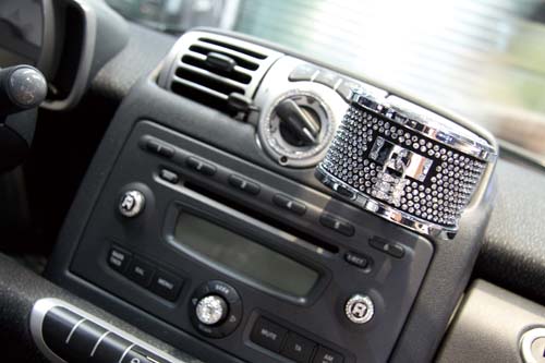 | 中控台僅以少量水鑽加以點綴控制旋鈕,有鑑於Smart車內置杯架不足之處則特別新增水鑽杯架。 |