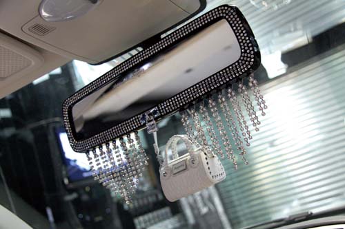 | 除了後視鏡改用水鑽式樣以增添車室氣氛之外,後視鏡上額外吊掛的小小手提包可是Anjuny主推新品,既可為香水還可做零錢包,多樣化 的設計功能巧思。 |
