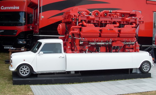 其實在這麼眾星雲集的汽車嘉年華會上,若僅展示一部加長型的老Mini車款的話,那真的會「掉漆」,但如果將一具排氣量達77公升的V18渦輪增壓柴油引擎給結合打造在一起,那人氣鐵定馬上翻兩番,這就是這家Cummins(康明斯)柴油引擎製造商眼光獨到的地方;果然,這輛無敵Mini隨即成為會場上最亮的爆點!