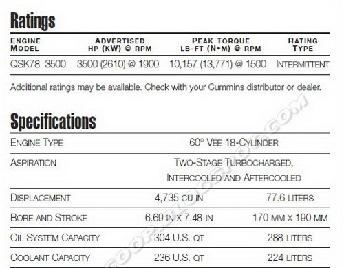 這顆編號為QSK78的柴油渦輪增壓引擎,乃是用於採礦業的超大型卡車身上,排氣量達77公升,採V18汽缸設計,最大馬力輸出達3500hp/1900rpm,且在1500rpm時即能釋放出達1405公斤米的最大扭力峰值,引擎本身長/寬/高尺寸分別3327/1633/2429mm,重量達到10800公斤,可運載重量更達驚人的360公噸!