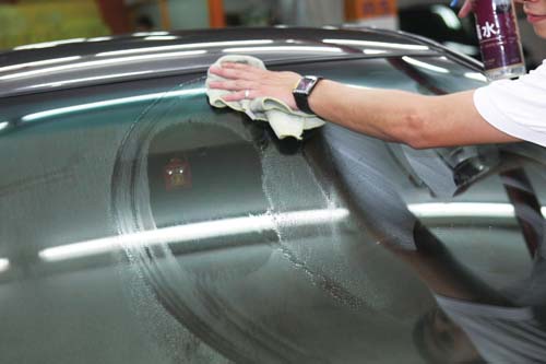 | 針對車窗進行「Super Coat」玻璃處理,做過之後馬上用水測試,果真擁有明顯的潑水效果。 |