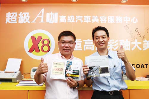 | 陳總經理(右)、羅總監(左)經營汽車美容業有很長的時間,提供專業技術、平實價格給所有車友,讓每一部經由超級A咖美容的愛車都 能亮晶晶。 |