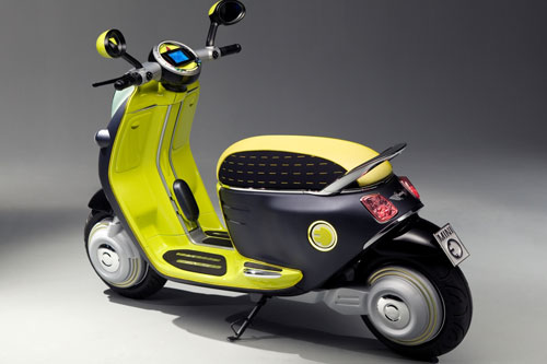 第一款MINI Scooter E Concept概念車源自於"兩人共享駕乘樂趣"的發想,更以目前40輛於英國進行道路試驗的MINI E電動車為原型,以鐵灰色車體搭配芥黃色後照鏡外蓋打造出高度對比的視覺感受,讓MINI E和MINI Scooter E Concept齊聲宣告實踐二氧化碳零排放的堅定決心。