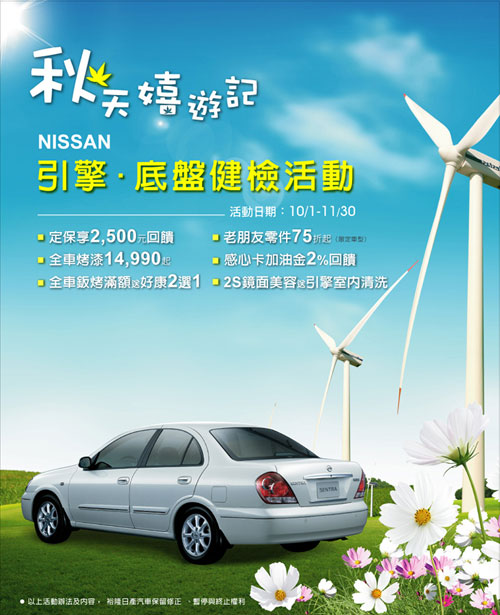 NISSAN「秋天嬉遊記」活動,除了上述原廠檢查服務及優惠之外,凡於活動期間刷NISSAN感心服務卡,另享週一、週三洗車打蠟9折、2S鏡面美容85折,及中油直營加油站刷卡金額2%回饋。相關活動詳情,請洽NISSAN服務專線 0800-088888或NISSAN企業網站www.nissan.com.tw。