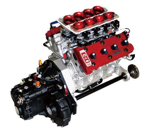 | 這具V8引擎由兩具經過修改的Suzuki重機引擎所組成,最高工作轉速達10,500rpm,並擁有高達500匹的最大馬力輸出。 |