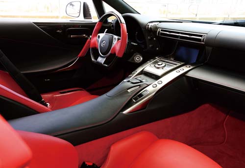 打開車門,映入眼簾的是兩張火紅跑車座椅,平底式的賽車方向盤展現濃濃跑格,很想把LFA當成是競技專用的戰鬥超跑,但其內裝皮革採手工製成,呈現出溫潤的奢華感受,且在中控檯的豪華配備與介面影響之下,LFA更像是一台奢華有餘的性能悍將,這看在Lexus的車迷眼中,兼具性能與豪華的一流超跑肯定更對味。