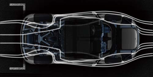 | 從流經車頭的空氣、引擎散熱用途的氣流導引與排出,還有煞車系統的冷卻氣流都被視為空氣力學設計的重要一環。 |