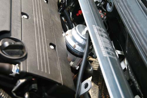 | 本車所採用渦輪為TD-04L,以2.0L排氣量來推動排氣葉片約在2800rpm時就可轉為正壓出力。上方兩條黑色條狀物便是變速箱換檔鋼索原廠 零件。 |