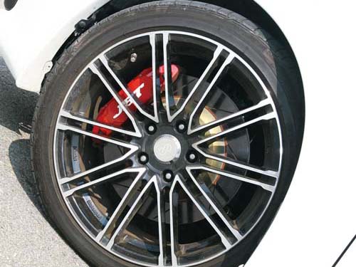 | 18吋鋁圈搭配JBT對向四活塞卡鉗,將整個鋁圈塞得滿滿的,氣勢就是與原廠高出許多。 |