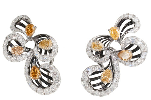耳環使用8顆漸層大地色系彩鑽(約2.53克拉),周邊鑲嵌88顆重約2.68克拉的鑽石。戒指使用咖啡橘黃色到黃色的漸層鑽石排列,以四顆大地色系彩鑽排列成6.15克拉重的花朵,周遭鑲嵌96顆總重0.90克拉的白鑽,另附上GIA證書。