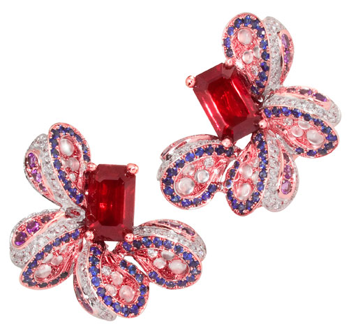 主石選用2顆總重4.75克拉的鴿血紅紅寶石,水滴型花瓣上鑲嵌264顆總重3.45克拉的鑽石、藍寶石、冰種白翡蛋面、紫水晶,另附有GRS證明書。