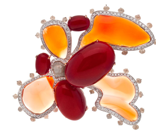 彩寶選用透光的火蛋白和不透光的阿卡珊瑚,配上週邊鑲嵌的無切割的鑽石原石,形成層層疊疊的四重對比,整件作品更大膽使用原石天然的形體作為設計呈現的一部分,可深層表現出翡歐力人文與自然結合的深刻品牌精神。