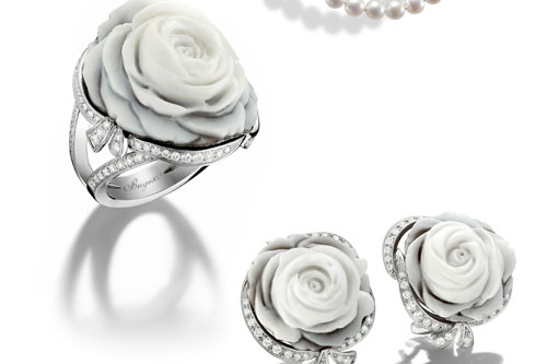 寶璣高級珠寶中的La Rose de La Reine系列同樣地以《玫瑰》為創作主題,重現品牌繆斯女神 – 法國瑪麗安東尼皇后的迷人世界。瑪麗安東尼皇后愛好大自然與可愛的花園,小提亞儂宮中繁盛的花朵,洛可可情調的粉色系賦予了La Rose de La Reine系列夢幻般女性氣息,整個系列由項鍊、戒指、耳環打造成一個專屬女人的珠寶御花園。La Rose de la Reine系列以貝殼浮雕工藝打造專屬寶璣的玫瑰印記,藉由雕工將貝殼蘊藏的層疊色澤,勾勒出含苞玫瑰的姿態,環繞著精巧的鑽石蝴蝶結,將玫瑰襯托得格外閃耀奪目,特別的是La Rose de La Reine項鍊結合另一美麗元素 – 珍珠,溫潤的色澤與典雅的質感經過時間的洗禮,仍是優雅與知性的最佳代名詞,無論是單獨成為一件珠寶配件或與玫瑰胸針一同佩戴,皆能展露女性變化萬千的風情。