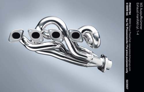 最佳化的排氣頭段是每缸管路都等長的設計,如此可讓排氣律動一致化,且徹底消除各歧管的壓力差,而像圖中這支E92 M3使用的頭段則 已到汽車工藝的極品,再做改裝或許已沒有必要 |