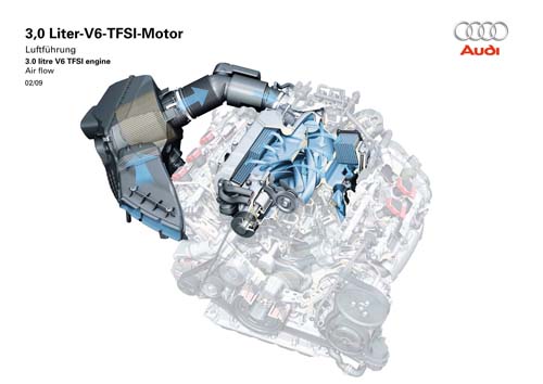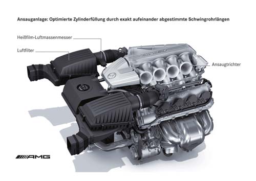 圖中兩顆引擎的透視圖,分別為M.Benz SLS的V8引擎與E60 M5的V10引擎,可以很清楚的看到汽缸頭上的進氣歧管內,每缸皆設有喇叭嘴狀 的進氣口,這是模仿多喉直噴的設計,可提高空氣進入燃燒室的速度與容量 |