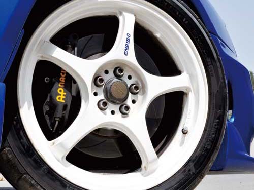 Impreza WRX有著一身優秀的運動基因,如果不加提取的話,恐怕是要被原廠那糟糕的避震器浪費掉,所以日本首席改裝品牌HKS HIPERMAX III避震器成了不二之選,雖然HKS不是專注於避震器的製造,但是此型號避震器的性能受到了無數用戶的認可。如此蠻橫的動力一定要選擇一套性能優異的煞車套件來搭配,所以AP Racing當仁不讓,既然該車為WRX,那麼流用STI版本的後對向雙活塞也在情理之中。行走方面Tuner選擇了重量超輕的5 Zigen單片式輪圈,配合橫濱ADVAN A13輪胎,抓地力保障的同時也兼顧了日常的街道行走,胎噪較小。