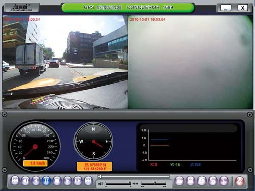 專用軟體的檢視畫面,上方兩個視窗為前後鏡頭拍攝的畫面重現,下方從左至右則是顯示車速、方向與G值曲線,不過資料更新有些停頓,顯示起來並不連貫。 |