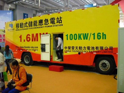 | 充電站不足的解決方案-「移動式充電站」,其電能容量高達160萬瓦、可以幫46部電池容量35kW的電動車充電。 |