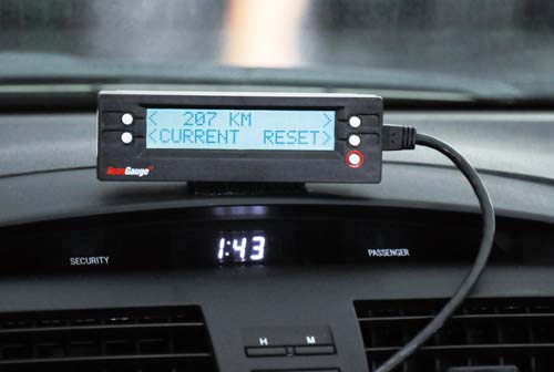 | 測試採用ScanGauge II多功能紀錄器,直接讀取行車電腦內的行駛里程與燃料消耗量,比起加滿油貼封條的方式準確許多。 |