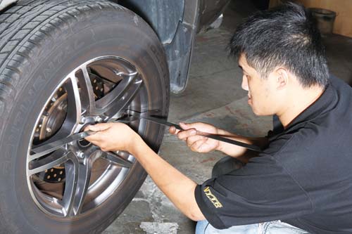 最後也是非常重要的步驟,就是在輪胎裝上之後,轉動輪胎觀察是否會磨到卡鉗,一般產品規格表中會註明可對應何種尺寸的鋁圈,但是每款鋁圈的形狀不盡相同,圈唇也許不會磨到,但是有可能骨架會閃不過,所以VTTR提供一種非常方便的測量方式,以VTTR的對向6活塞搭配直徑330mm碟盤來說,丈量鋁圈寬度超過365mm就可以閃過,而深度要有52.5mm,有了這些數據就不用怕鋁圈閃不過,改完煞車又要換一組圈,真是勞民傷財啊!