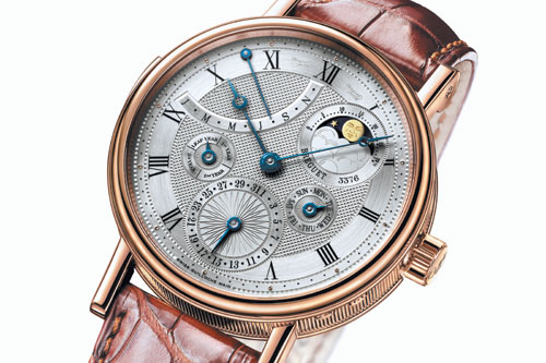 Classique Grande Complication 5447腕錶不僅在複雜功能的結合創造出令人驚嘆的成果,在錶款細微之處已達賞心悅目的美學顛峰,協調有致的39毫米直徑錶殼,搭配清晰實用的錶盤,10:30位置設有一個精緻的逆向月份顯示,當一年已盡時,行至弧底的指標瞬即跳回一月位置,重新開始其新一輪的運轉。日曆顯示在6時位置的小錶盤上,鐫刻其上的精細太陽紋圖案每一格相等於一天,紋理有致的鐫刻裝飾圖案不但可以有效地消除反光,使閱讀時一目了然,讀取萬年曆時亦清晰無比,為收藏家們的不二之選。。